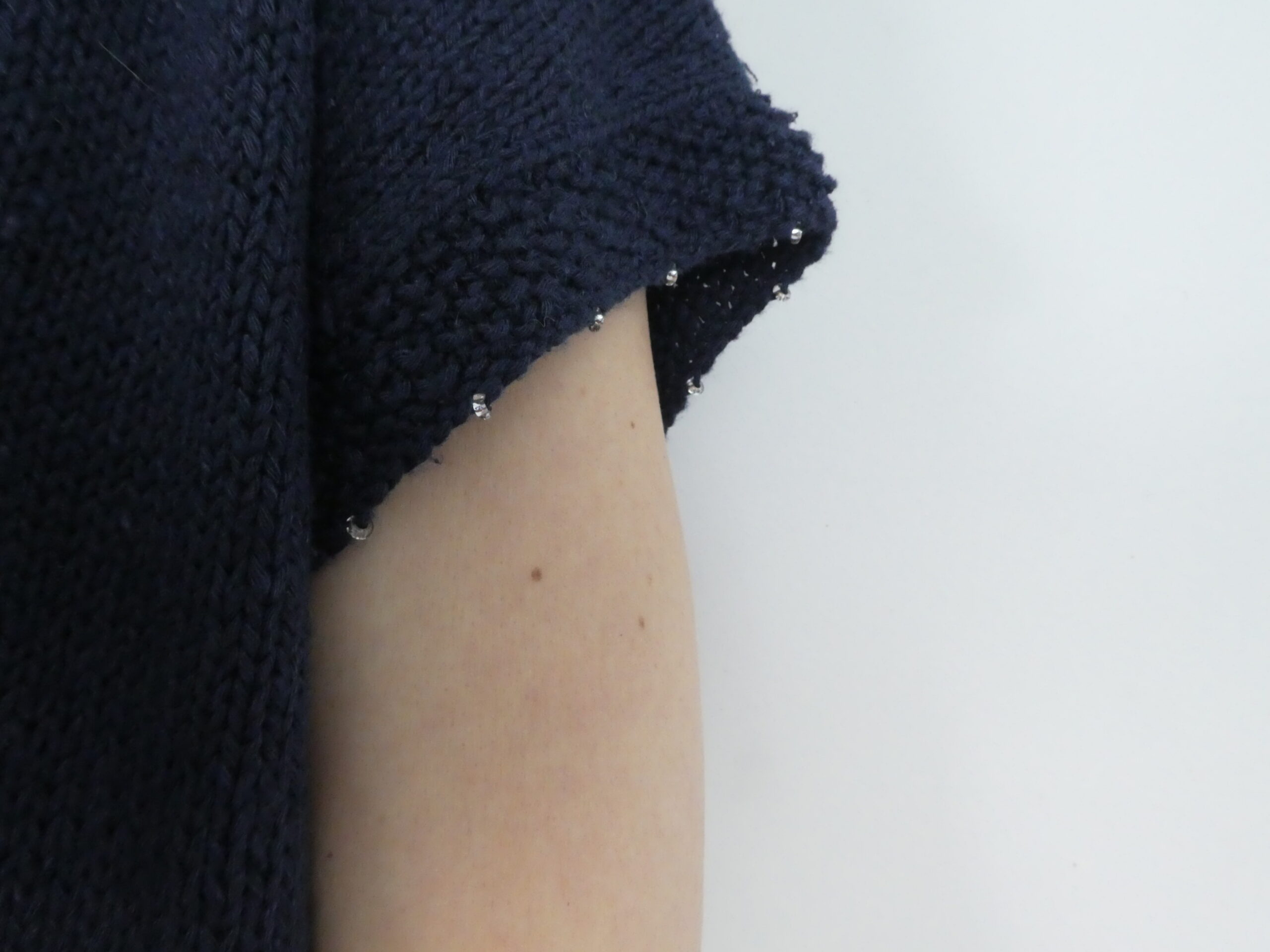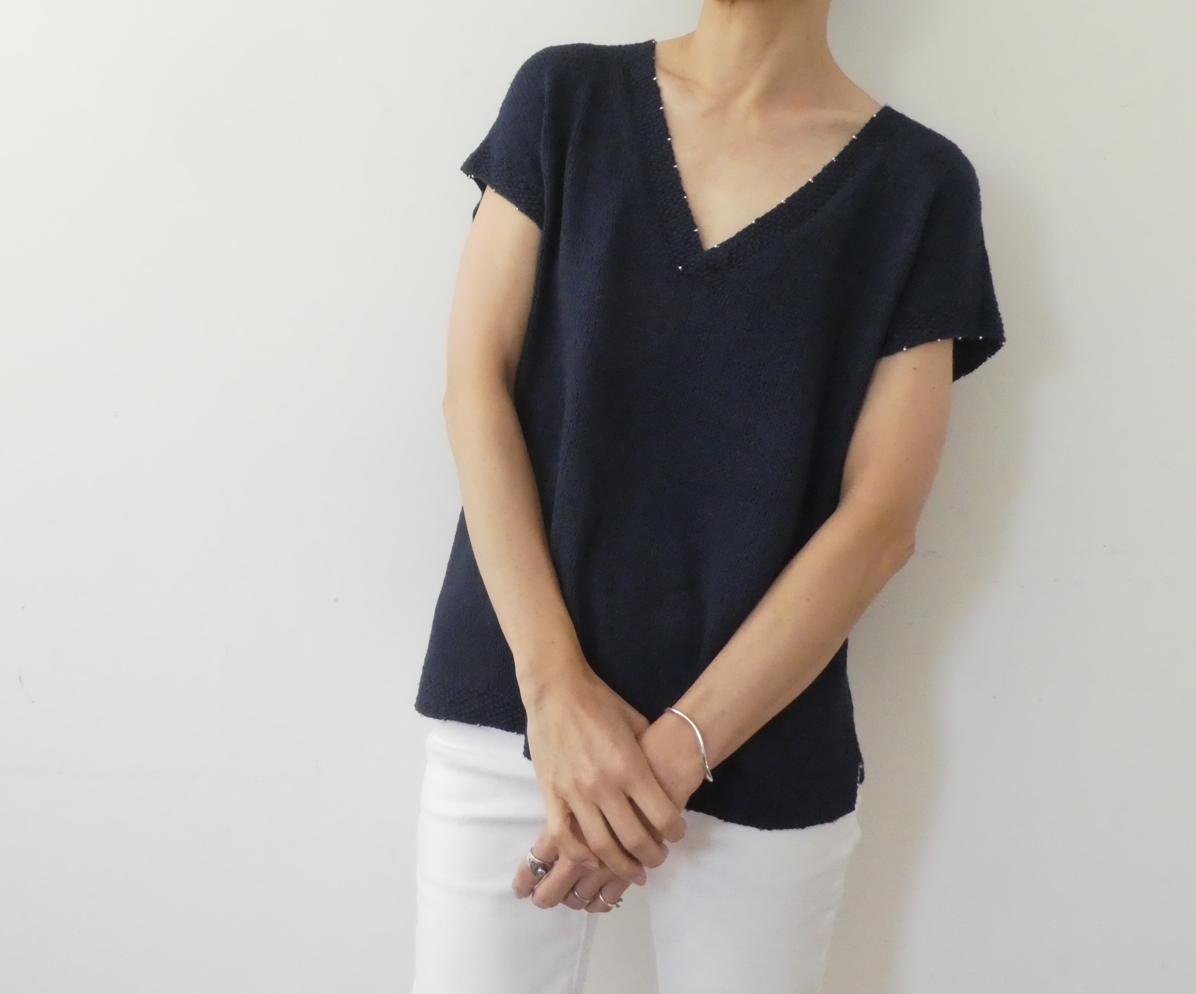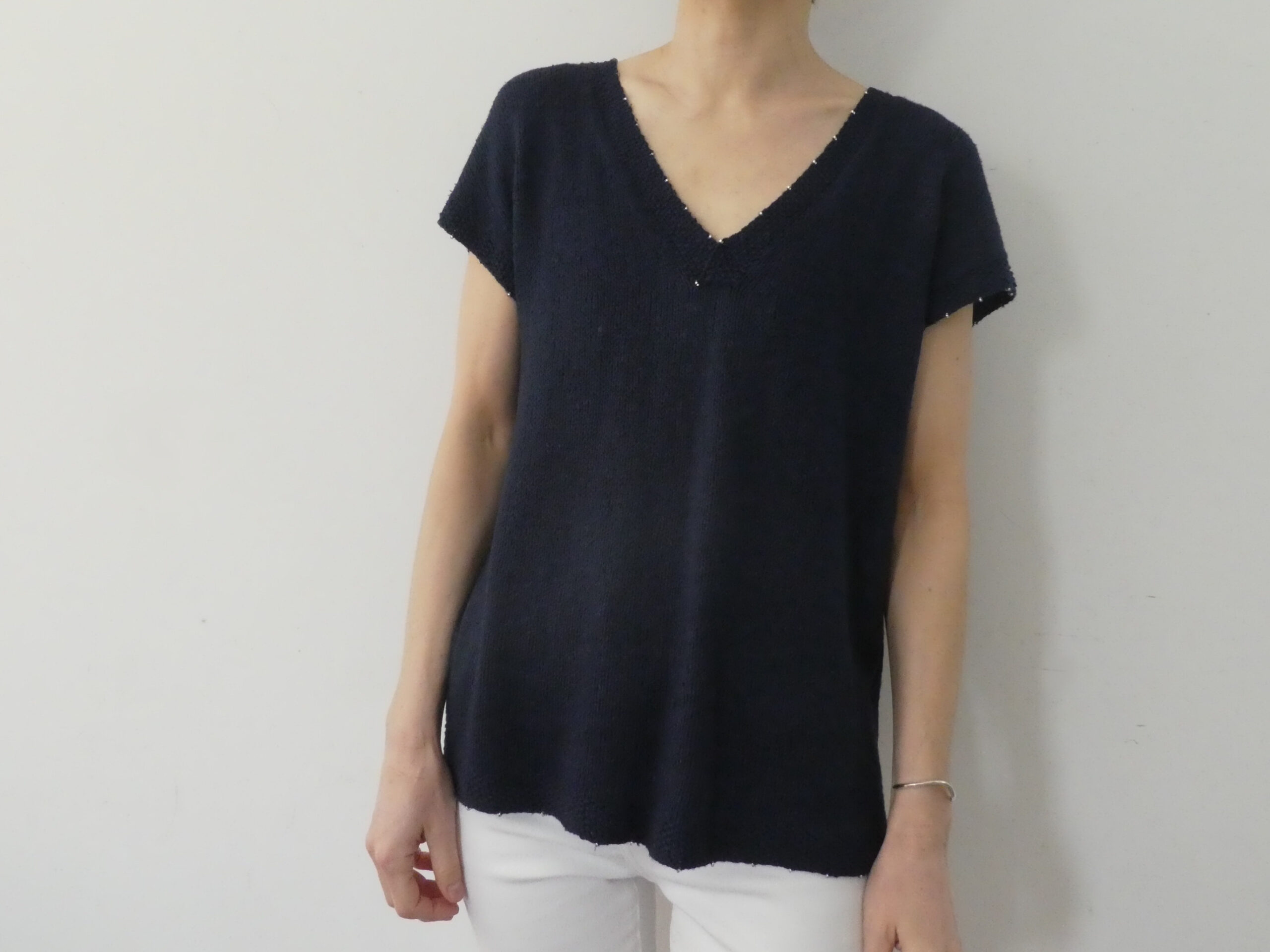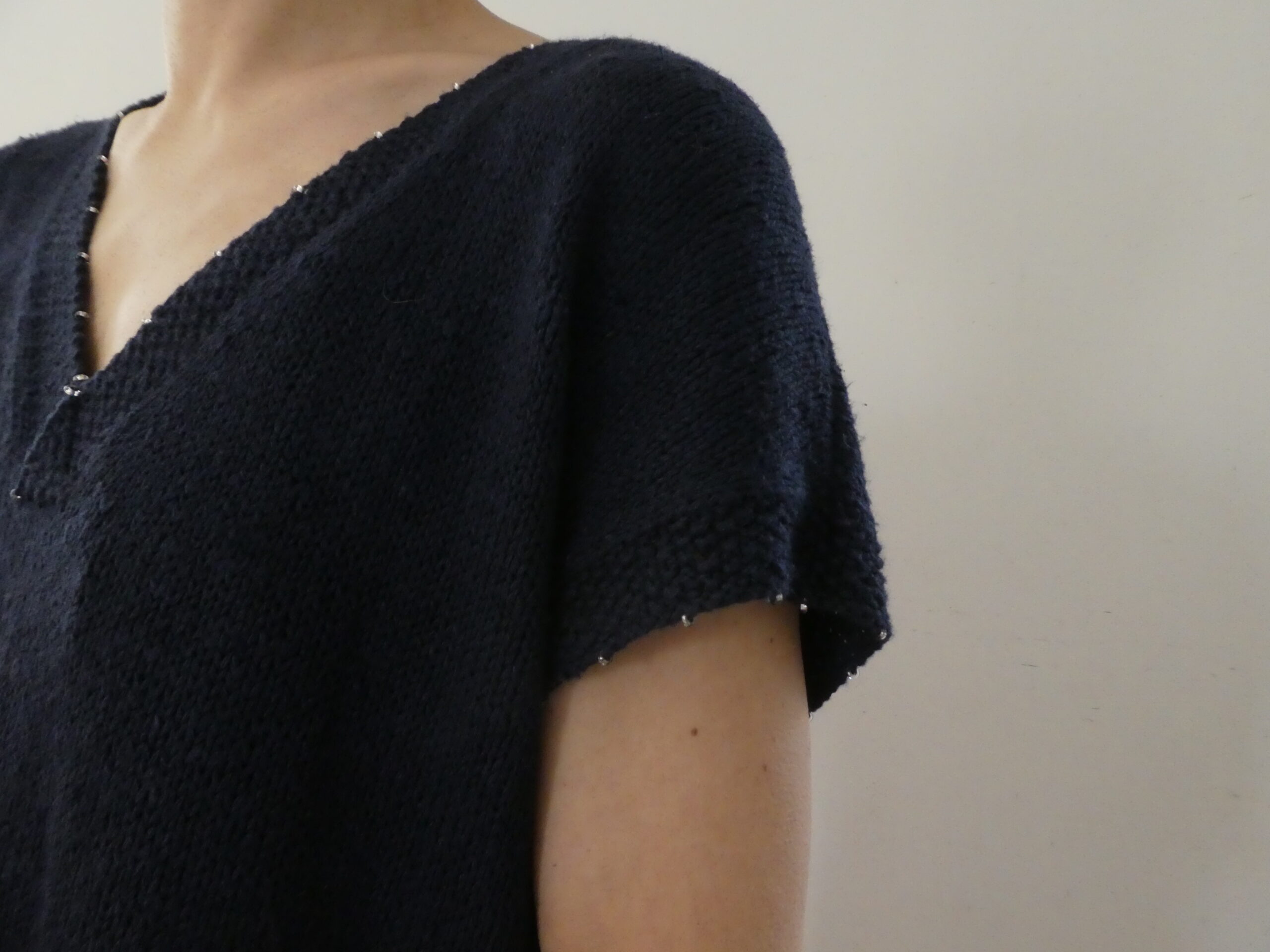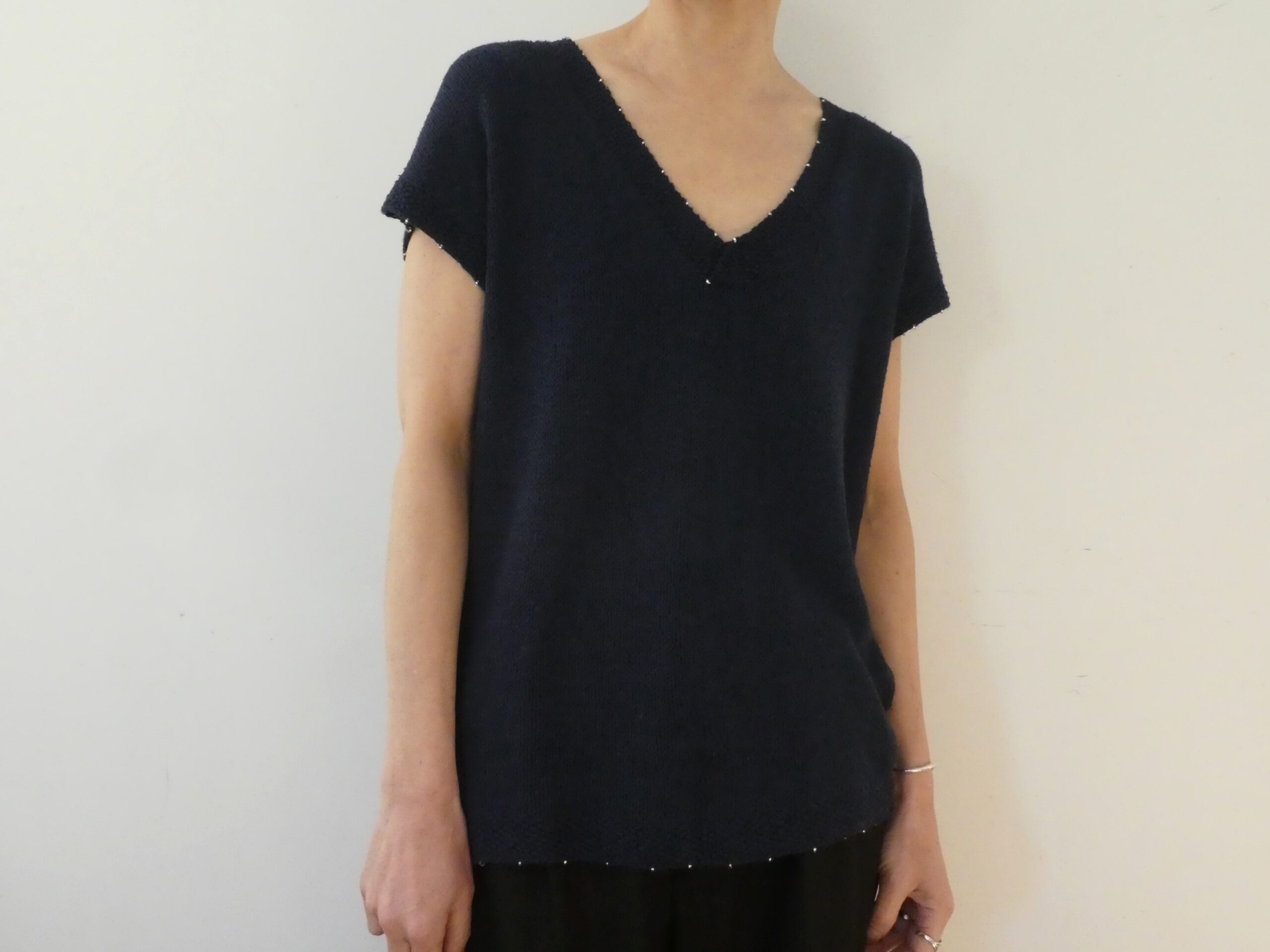 What makes this design stand out is its understated embellishment. You integrate fine Japanese glass beads directly into the knit, so they catch the light with every movement. As a result, the top feels both natural and quietly radiant.